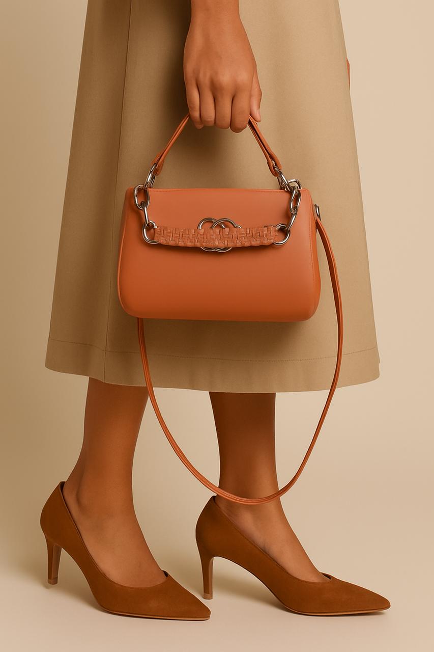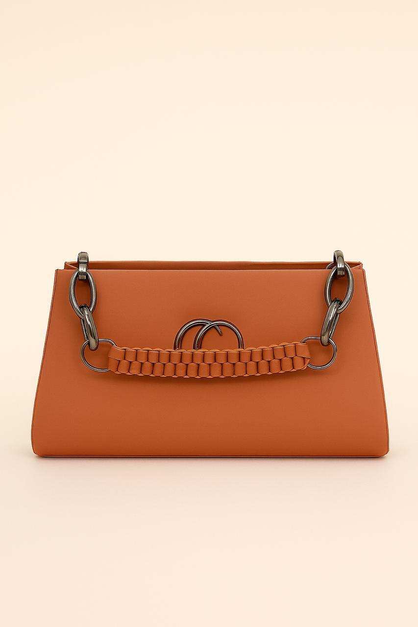 Experience timeless sophistication with our luxurious brown  handbag, meticulously crafted for the modern woman. Featuring a distinctive braided handle intertwined with gleaming metal chain accents, this handbag seamlessly blends elegance with durability. Its sleek silhouette offers ample space for your daily essentials, making it an ideal accessory for both casual outings and formal occasions. The rich brown color complements any wardrobe, while the thoughtfully designed interior includes secure zip and slip pockets to keep your belongings organized. Elevate your style and make a statement wherever you go with this must-have piece.